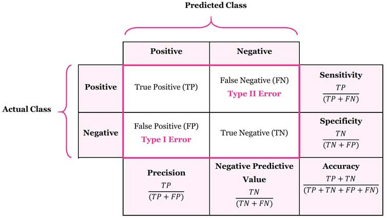 It can also be helpful to make a confusion matrix, formed from the 4 white squares in the middle of the diagram below, with each square containing a number. In general you want high numbers of data points in TP or TN, and low numbers in FP and FN