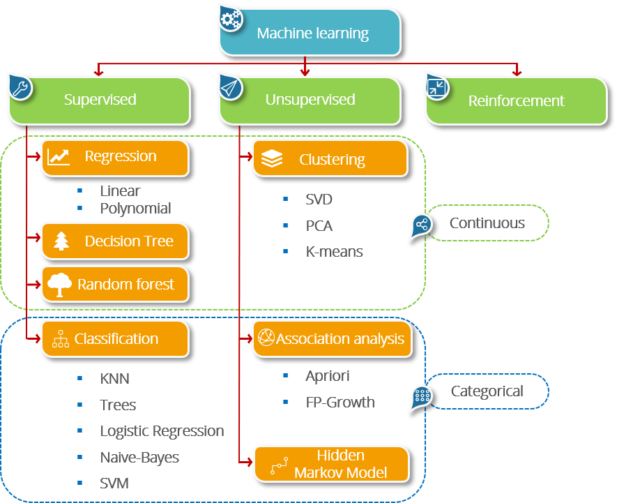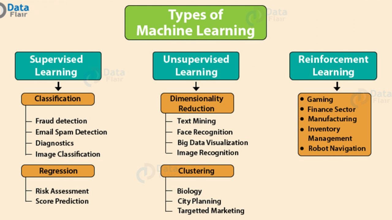 When starting out, there are 2 broad categories of ML, supervised and unsupervised: